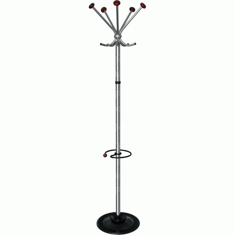 Офисная вешалка стойка для одежды напольная на 5 крючков. Снабжена подставкой для зонтов.Выполнена из оцинкованной стали с полимерным покрытием. Штанга из зеркальной нержавеющей стали. Декоративные наконечники (шары) – натуральное дерево. Поставляется в разобранном виде в картонной таре. Элементы вешалки покрыты защитной полиэтиленовой пленкой.