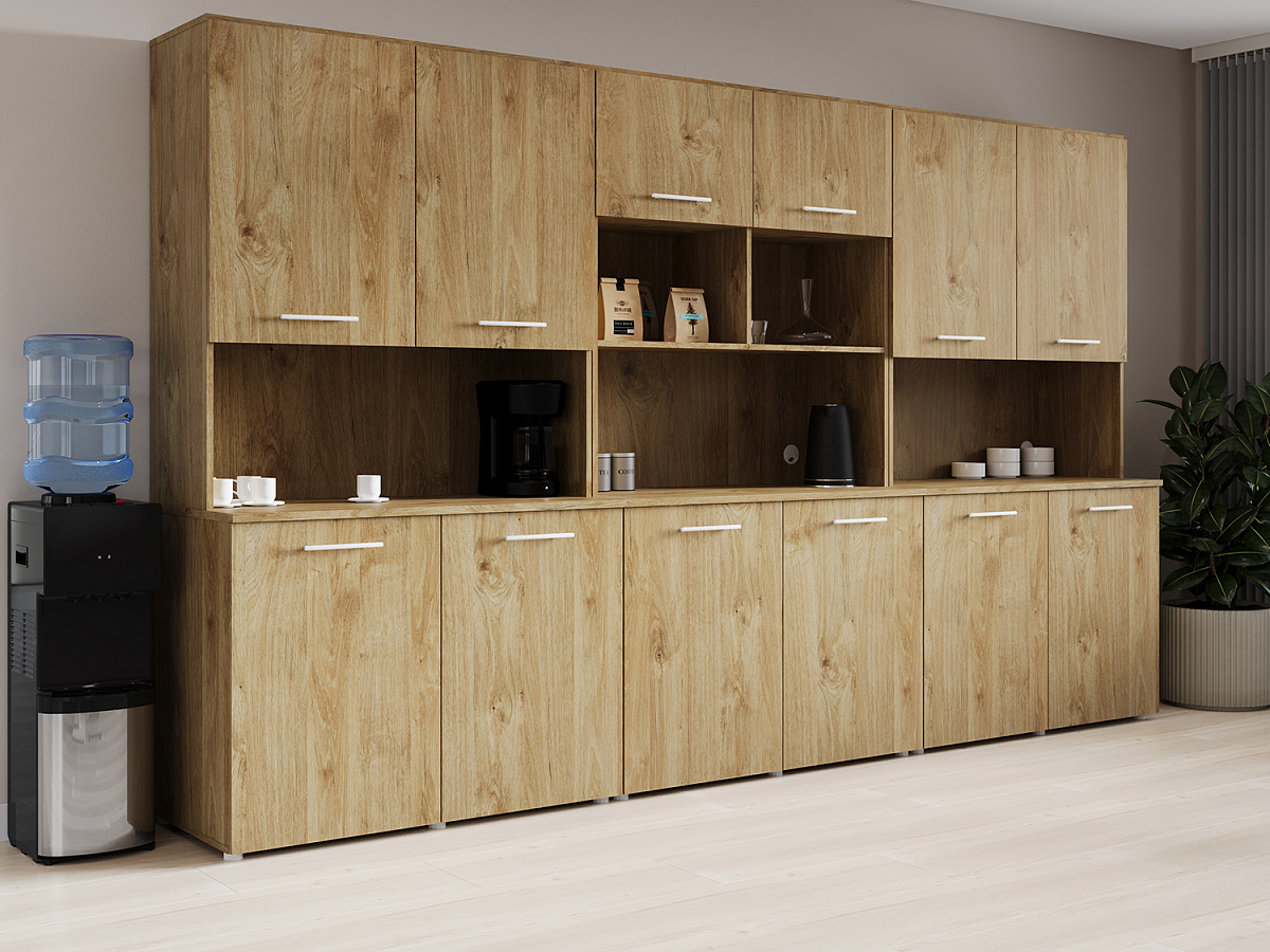 С офисными кухнями Fit вы создадите уютное место для отдыха и перекуса, делая каждый рабочий день более комфортным. Они оснащены всеми необходимыми элементами: удобные шкафы для хранения, эргономичная рабочая поверхность и универсальный дизайн, который гармонично впишется в любой интерьер.