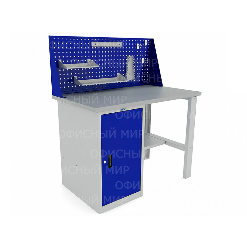 Верстак окрашен порошковой краской, цвет покрытия корпуса серый шагрень (RAL 7038), лицевая панель дверцы тумбы – синий шагрень (RAL 5002)