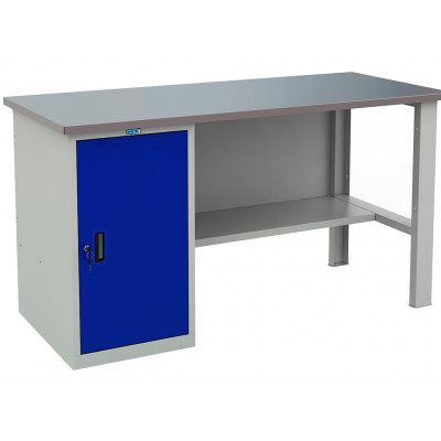 Верстак окрашен порошковой краской, цвет покрытия корпуса серый шагрень (RAL 7038), лицевая панель дверцы тумбы – синий шагрень (RAL 5002)