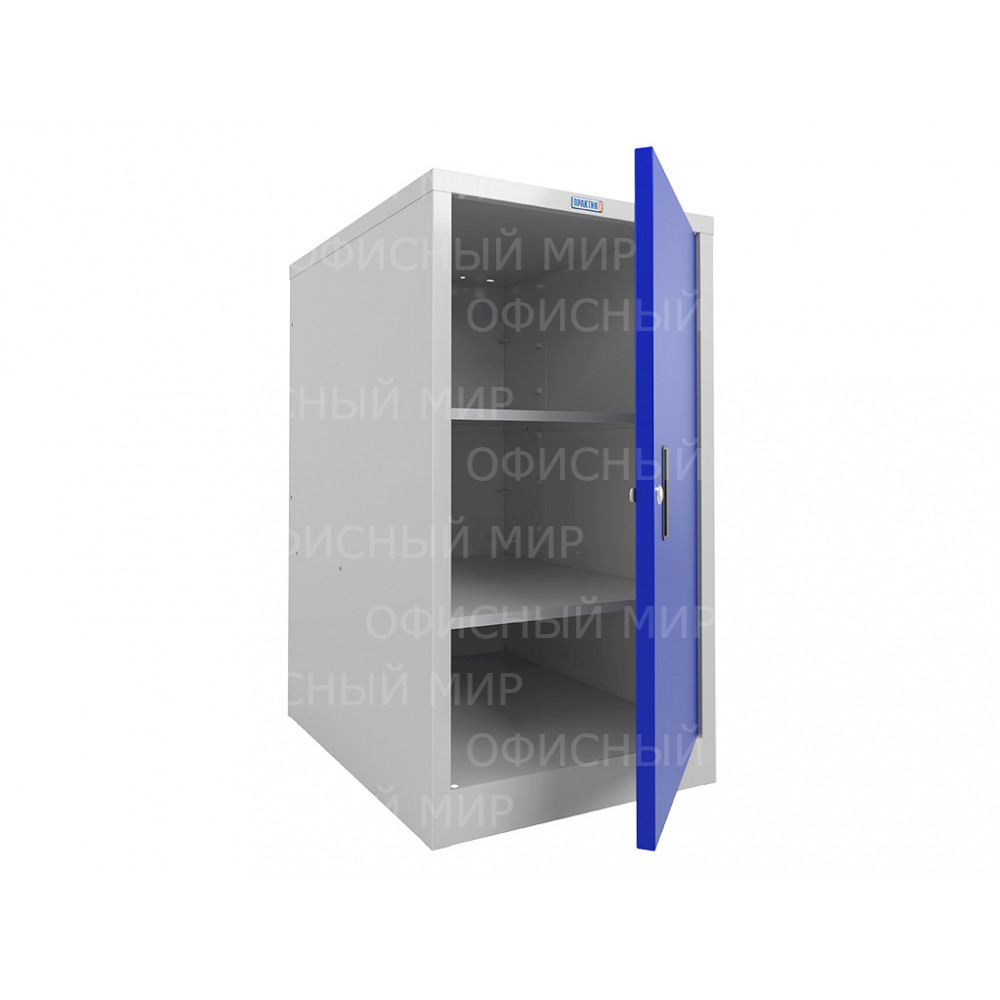 Верстак состоит из тумбы WD1 и опоры F1 .Тумба укомплектована 2-мя съемными регулируемыми полками и 1 дверцей, возможность смены стороны открывания двери. Ключевой замок на дверце тумбы. Нагрузка на полку 30 кг.
