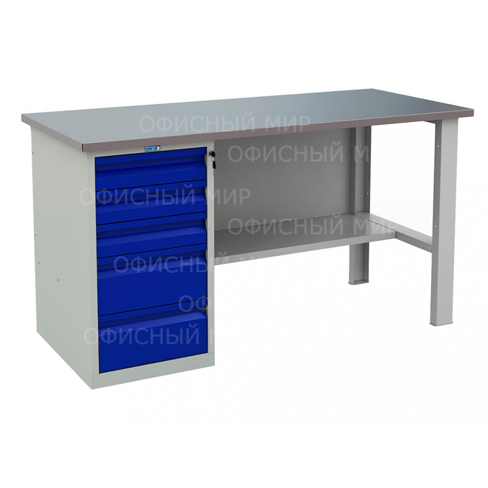 Верстак окрашен порошковой краской, цвет покрытия корпуса серый шагрень (RAL 7038), лицевая панель дверцы тумбы – синий шагрень (RAL 5002)