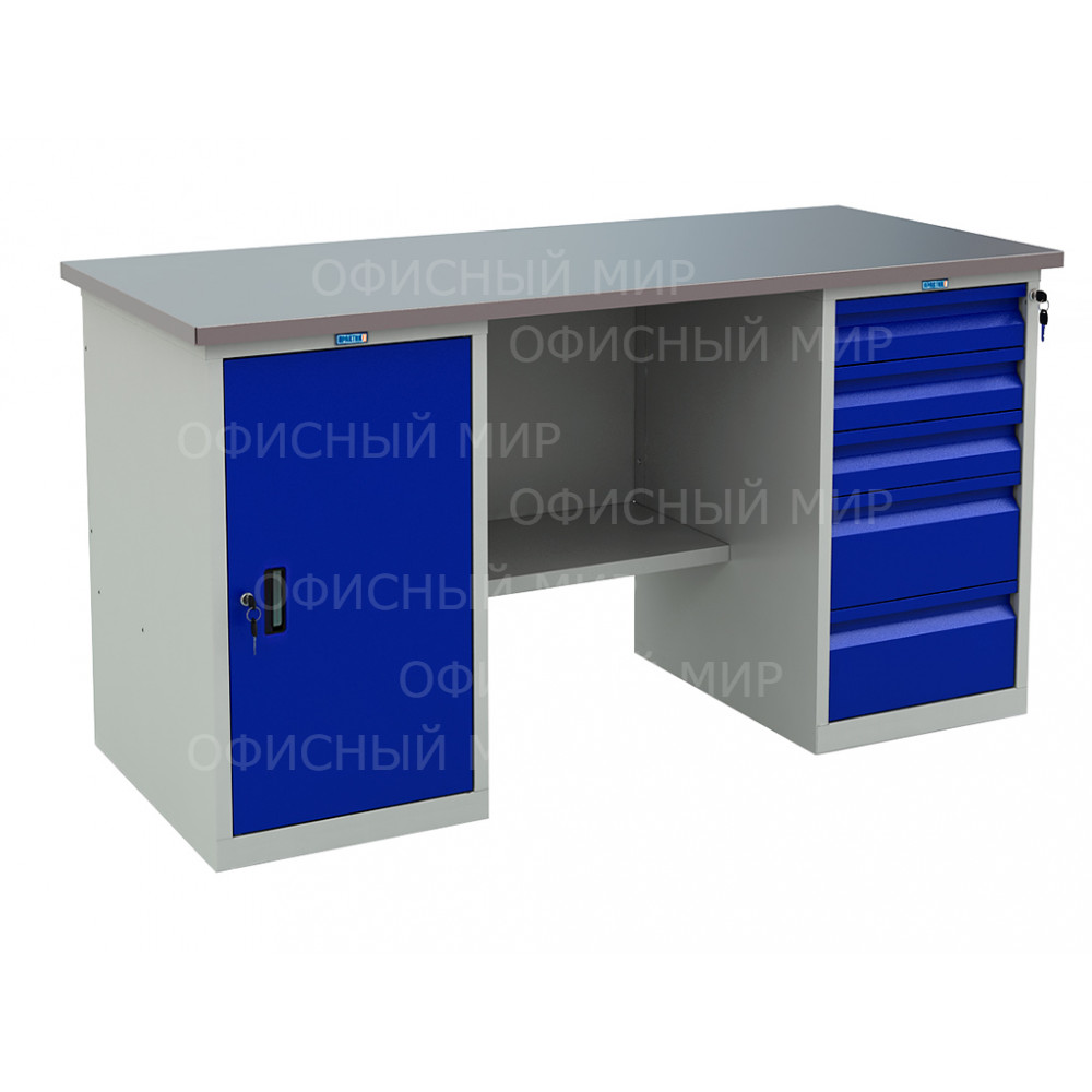 Верстак окрашен порошковой краской, цвет покрытия корпуса серый шагрень (RAL 7038), лицевая панель дверцы тумбы – синий шагрень (RAL 5002)