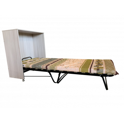 Механизм складывания соединен с тумбой, сложить и разложить раскладушку сможет даже ребенок. Незаменимый вариант для небольшой комнаты, с возможностью сэкономить место в помещении, придвинув раскладушку к стене. Представлена в 2-х вариантах: тумба и тумба-комод (имитация). Ортопедическое основание 14 ламелей. Матрас ППУ высотой 60 мм, в чехле полиэстер. Нагрузка на спальное место до 120 кг. Размер: 1900*800. В собранном виде габариты тумбы: глубина 420, длина 890, высота 1003 (вместе с колесами)