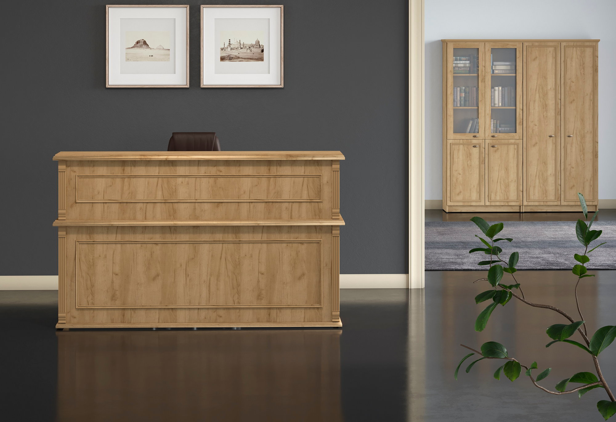RAUT - это стойка ресепшен в классическом стиле. Она создана с учетом лучших качеств классической мебели, включая теплые тона натурального дерева и декоративные элементы, такие, как карнизы и профильные рамки на фасадах.