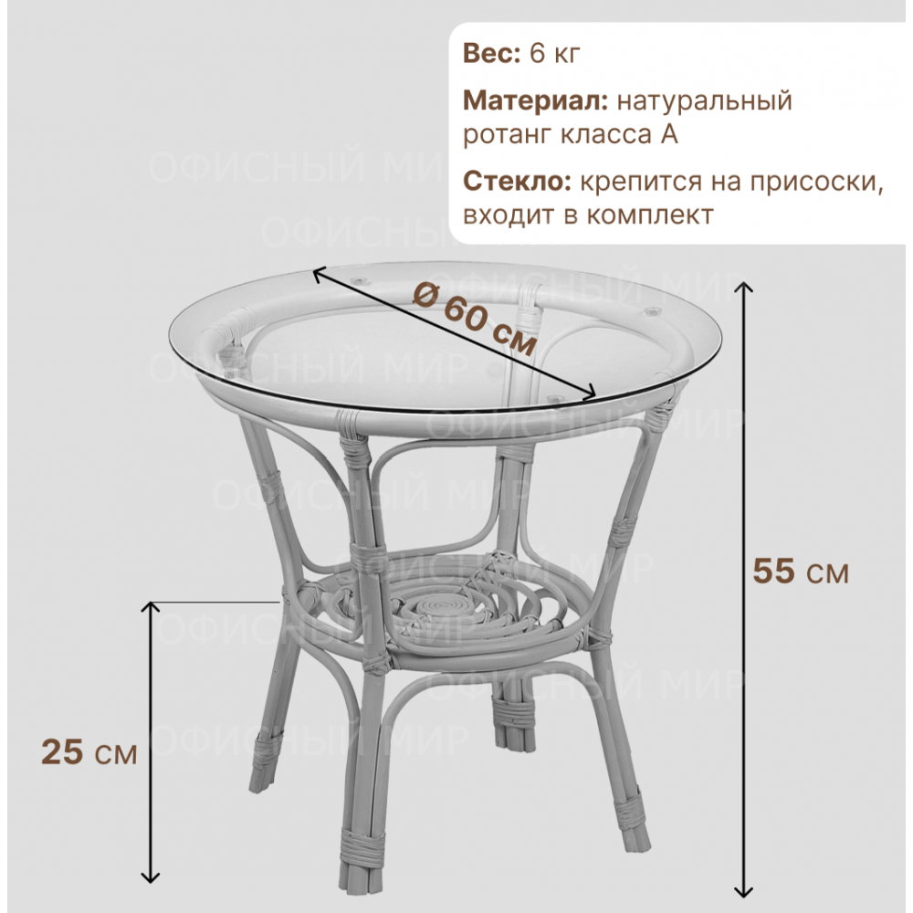 Набор состоит из двух удобных кресел с мягкими подушками и круглого стола со стеклянной поверхностью. Стеклянная столешница надежно фиксируется с помощью специальных креплений-присосок, обеспечивая безопасность эксплуатации. Габариты кресел: 70x65x75 см, вес одного кресла составляет всего 5 кг. Высота стола — 55 см, диаметр — 60-65 см, а его масса — 6 кг.