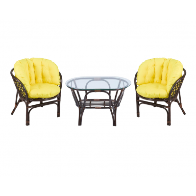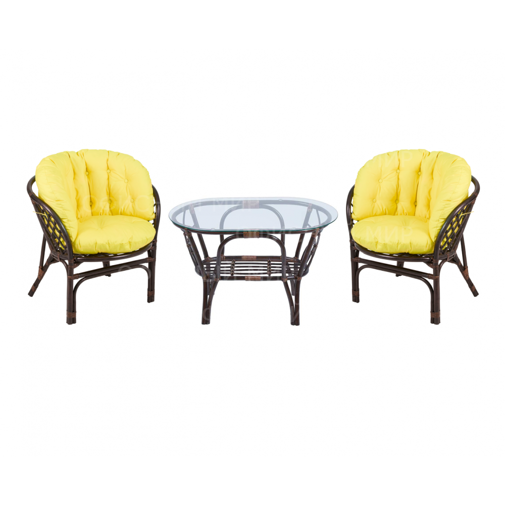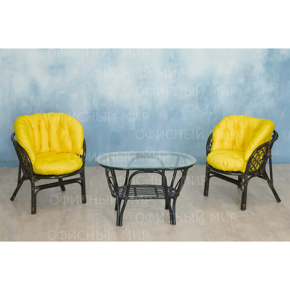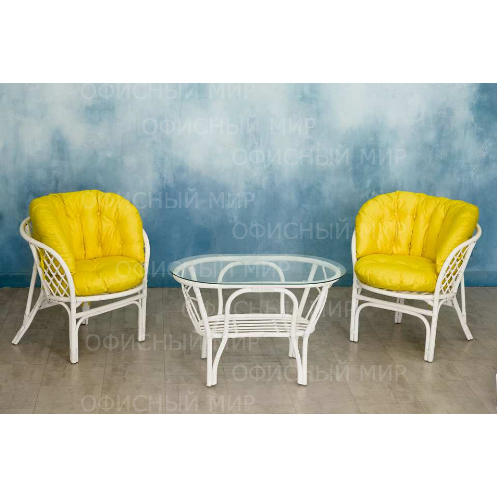 — В набор входят два удобных кресла с мягкими подушками и стильный круглый столик с прозрачной стеклянной столешницей.
