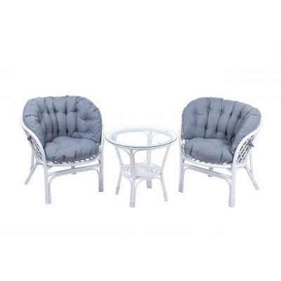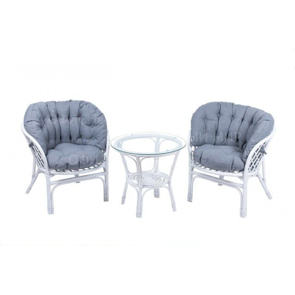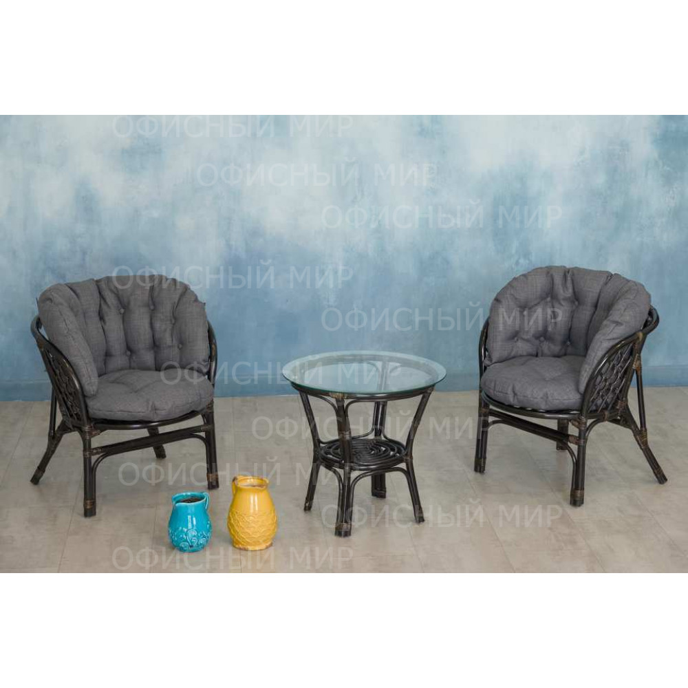 — В набор входят два удобных кресла с мягкими подушками и стильный круглый столик с прозрачной стеклянной столешницей.