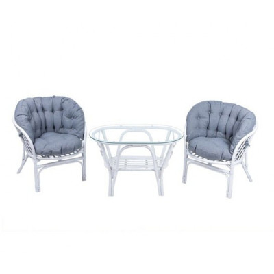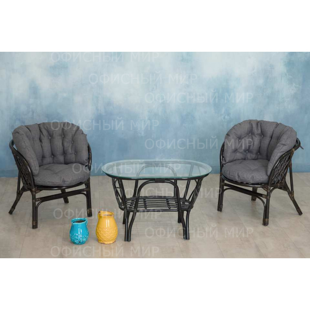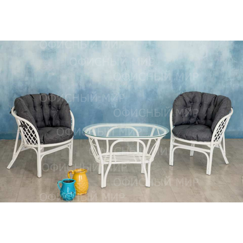 — В набор входят два удобных кресла с мягкими подушками и стильный круглый столик с прозрачной стеклянной столешницей.
