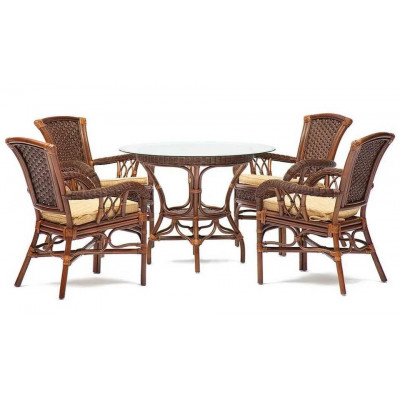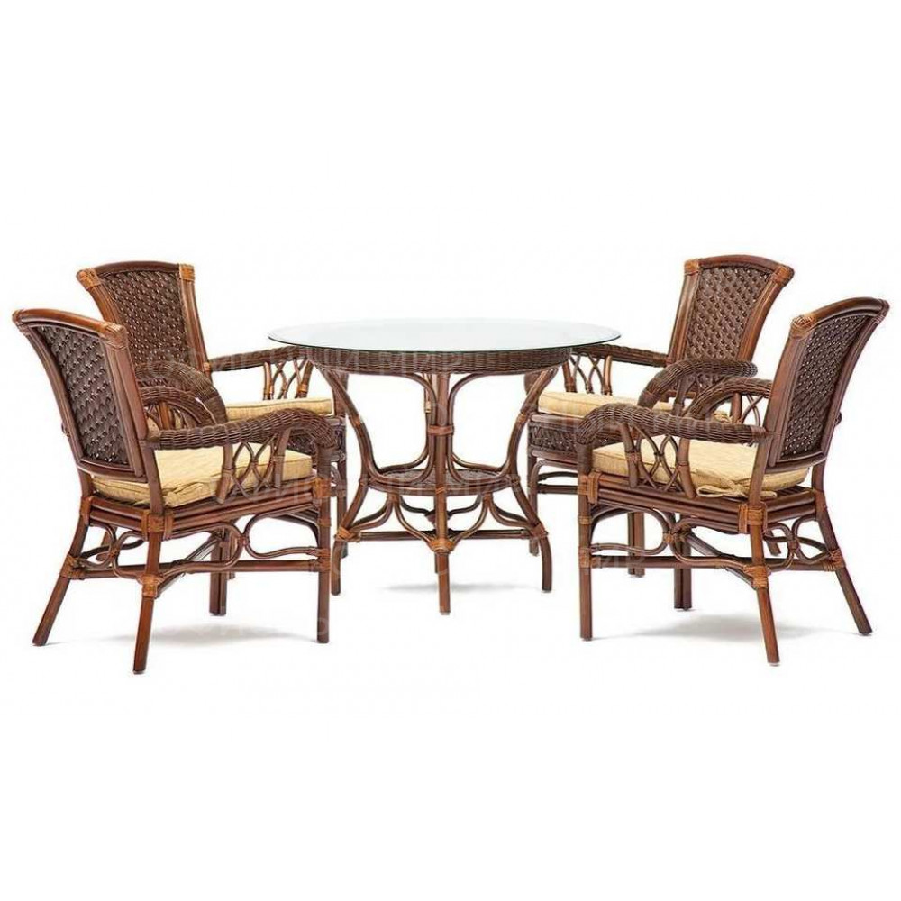 Комплект обеденный из натурального ротанга состоит из стола и четырех стульев.
