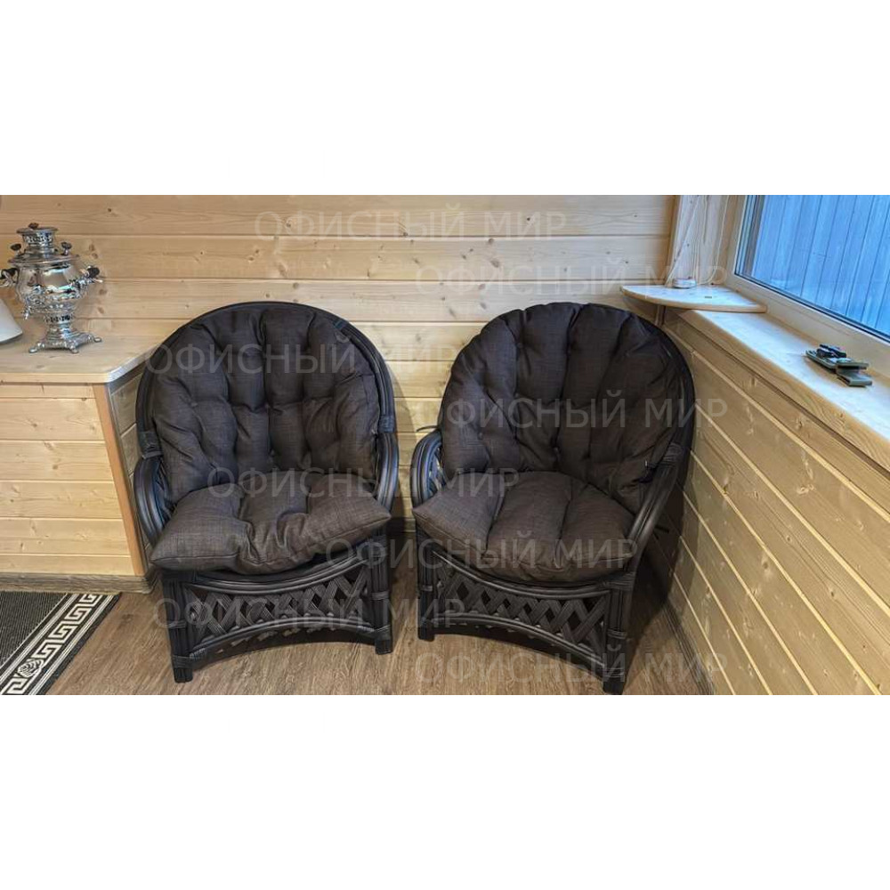 •Два кресла: габариты 75 х 75 х 95 см, вес 10 кг каждое. Стильные и удобные, они образуют уютное пространство для отдыха и общения, рассчитанное на нагрузку до 130 кг.