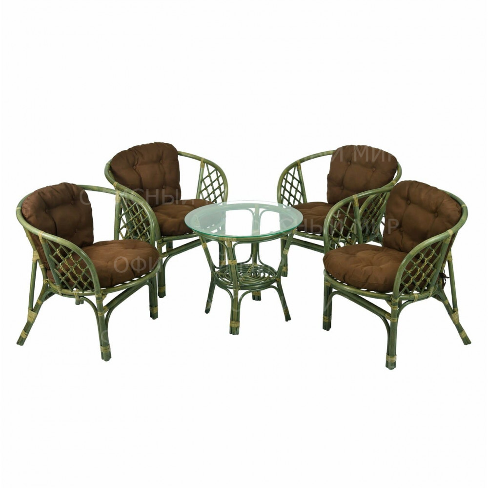 Комплект «Багама» из натурального ротанга станет прекрасным дополнением вашего сада или патио благодаря своему изысканному дизайну и натуральным материалам. Изготовленный вручную в Индонезии, набор включает круглый столик и четыре кресла, окрашенные в приятный оттенок, подчеркнутый удобными коричневыми подушками для сидений.