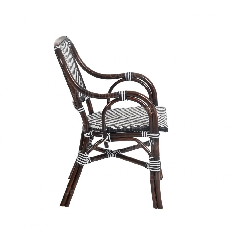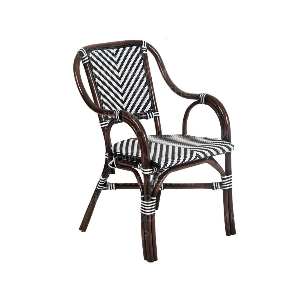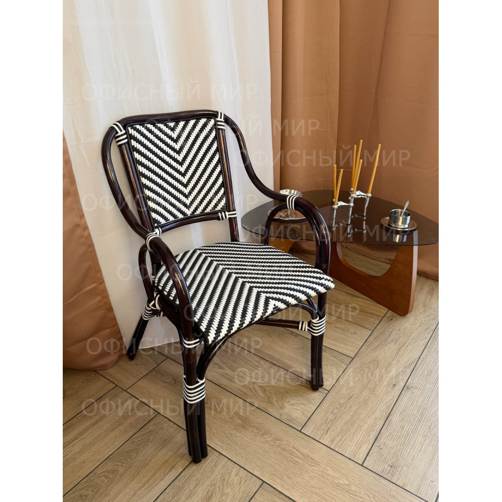 Универсальное кресло из комбинированного ротанга сочетает в себе стиль и функциональность. Его каркас выполнен из прочного ротанга благородного темно-коричневого цвета, а сиденье и спинка украшены плетением в черно-белую полоску, что придает изделию современный и свежий вид. Кресла из ротанга идеально подходят как для использования на даче, так и в кафе, так как материал устойчив к воздействию погодных условий. Это кресло станет отличным дополнением к вашему саду, террасе или кафе, обеспечивая комфорт и эстетическое удовольствие.
