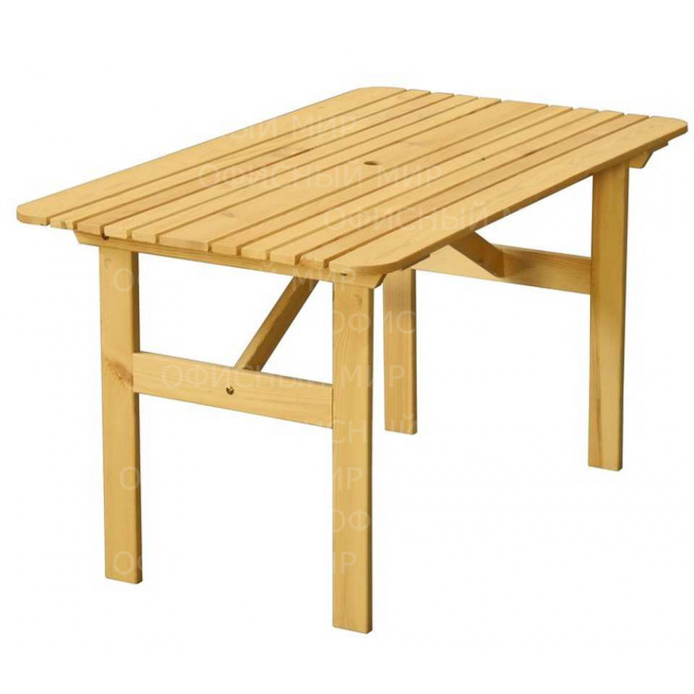 Два продольных распора не позволяют столу раскачиваться. Отверстие в центре стола предназначено для установки зонта, в тени которого ваш отдых станет еще комфортнее. Изделие неокрашенное.